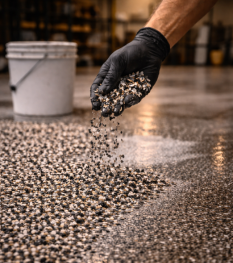 The gold standard for Plant City homes. We use a Diamond Grinding process (never acid wash) to open the concrete pores, followed by a deeply penetrating primer, a full broadcast of Simiron vinyl flakes, and a UV-resistant clear coat.