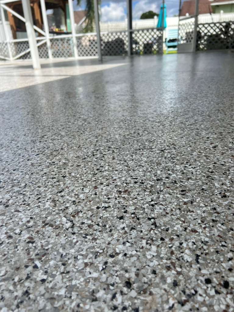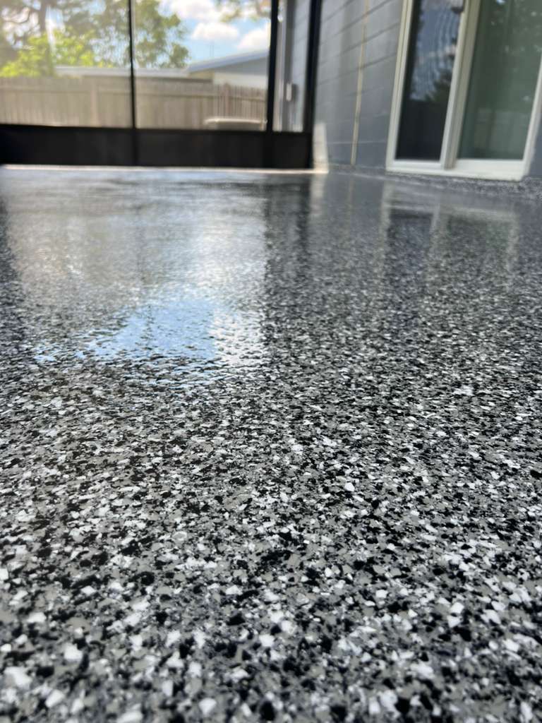 The gold standard for Plant City homes. We use a Diamond Grinding process (never acid wash) to open the concrete pores, followed by a deeply penetrating primer, a full broadcast of Simiron vinyl flakes, and a UV-resistant clear coat.
